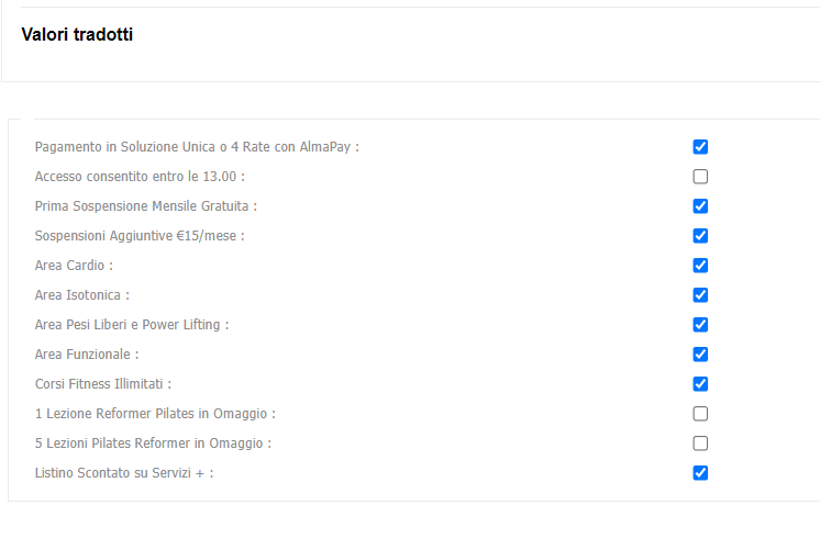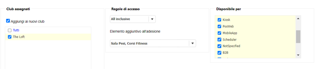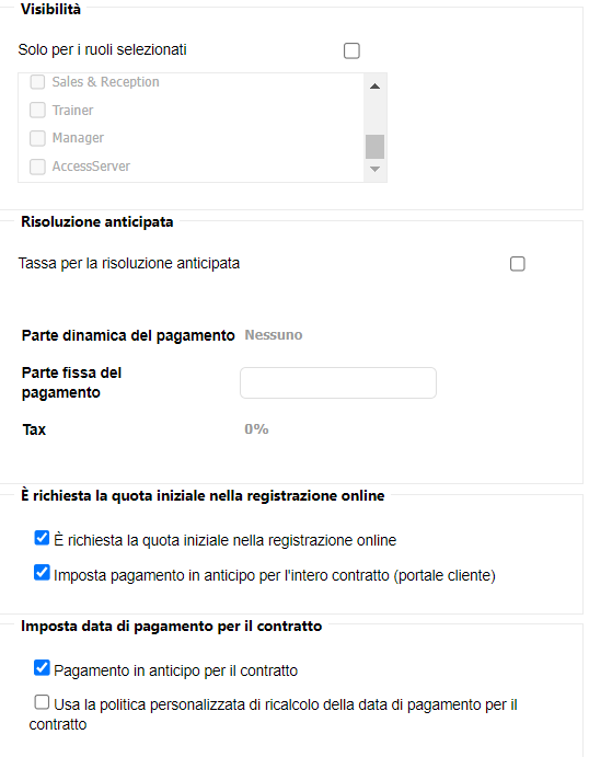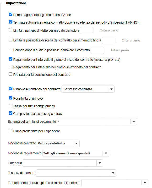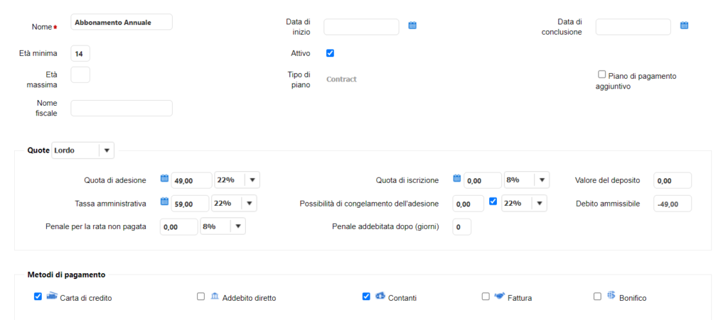 Come creare un Piano di Pagamento Annuale 20 Luglio 5, 2024 Segui questa guida per imparare a impostare il tuo nuovo Abbonamento Annuale. La creazione di un abbonamento si suddivide in: Nome e PagamentiImpostazioniRegole di Accesso e Client Portal Nome e Pagamenti Nome: inserisci il nome del tuo abbonamento.Età minima: inserisci l’età minima per sottoscrivere l’abbonamento.Attivo: flagga questa casella se vuoi che l’abbonamento sia disponibile alla vendita.Quota di Adesione: inserisci la quota che equivale al coefficiente mensile del tuo Abbonamento Annuale.Tassa Amministrativa: inserisci la quota di attivazione.Possibilità di congelamento: flagga questa casella se l’abbonamento offre periodi di sospensione.Metodi di Pagamento: seleziona i metodi tramite cui è possibile pagare l’abbonamento. Calendario dei Pagamenti: seleziona 1 Mese per far in modo che il pagamento ricorrente venga richiesto a cadenza mensile.Periodo di Impegno: seleziona la durata dell’abbonamento pari a un anno.Periodo minimo di Recesso: seleziona il numero di giorni entro il quale è possibile recedere il contratto. Impostazioni In questa sezione flagga le seguenti caselle:Primo pagamento il giorno dell’iscrizione Termina automaticamente contratto dopo la scadenza del periodo di impegnoPagamento per l’intervallo il giorno di inizio del contratto (nessun prorata) Rinnovo automatico del contratto (- lo stesso contratto) Possibilità di RinnovoCan Pay for classes using contract Regole di Accesso e Client Portal In questa sezione flagga le seguenti caselle:E’ richiesta la quota iniziale nella registrazione online, Imposta pagamento in anticipo per l’intero contratto (Client Portal) Pagamento in anticipo per il contratto Seleziona il nome del tuo Club in Club Assegnati. Flagga tutte le caselle in Disponibile per. Seleziona i Tag che vuoi siano visibili sul Client Portal. Seleziona i prodotti che vuoi siano visibili sul Client Portal.